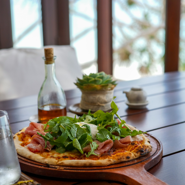 Tomato sauce, Mozzarella (cheese), Italian Rocket, Italian Balsamic Vinegar.